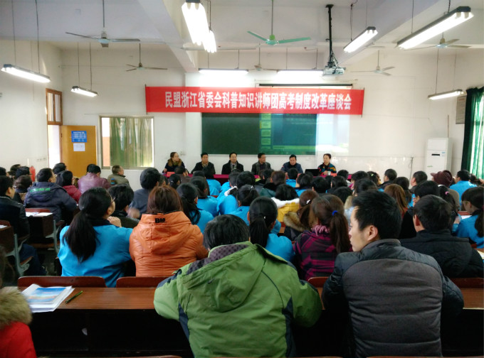 2月9日,淳安縣汾口中學(xué)——杭州市最偏遠(yuǎn)地區(qū)的中學(xué)迎來(lái)了一場(chǎng)“及時(shí)雨”:在民盟省委會(huì)科普知識(shí)講師團(tuán)團(tuán)長(zhǎng)陳漭,民盟省委會(huì)社會(huì)服務(wù)部副部長(zhǎng)鄭霞意的帶領(lǐng)下,由浙江大學(xué)城市學(xué)院副院長(zhǎng)、民盟省委會(huì)科普知識(shí)講師團(tuán)成員朱永平教授主講的《確定選考科目需要考慮的幾個(gè)因素——“浙江省深化高?荚囌猩贫染C合改革試點(diǎn)方案”初探》走進(jìn)了該校,淳安縣人大副主任、民盟淳安縣支部主委何建法致辭,淳安縣教育局黨委副書(shū)記、副局長(zhǎng)吳建明、學(xué)校高一學(xué)生、老師及家長(zhǎng)共100多人聆聽(tīng)了報(bào)告。